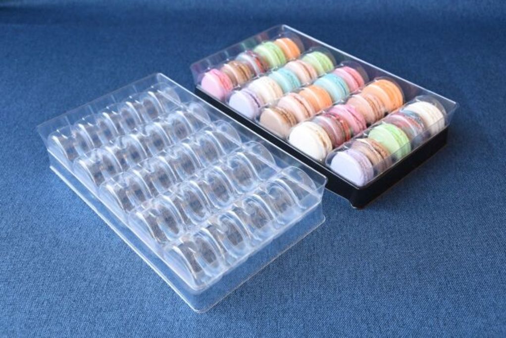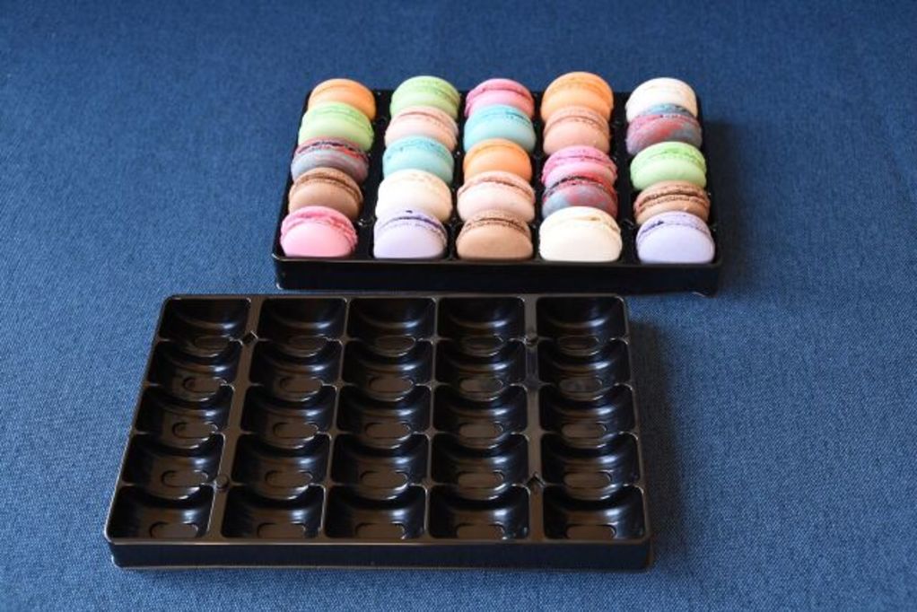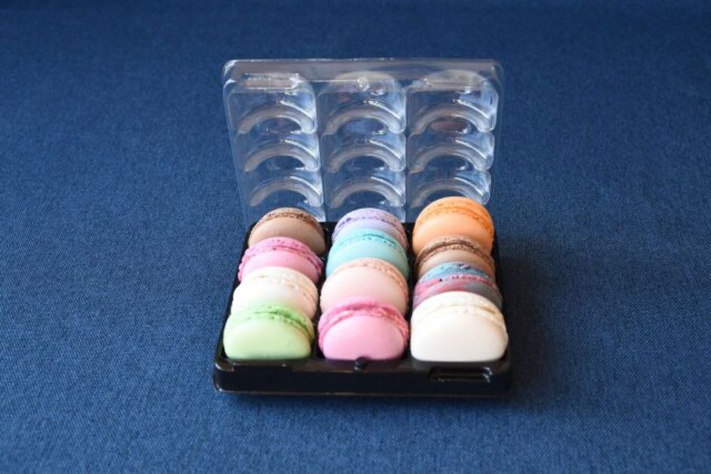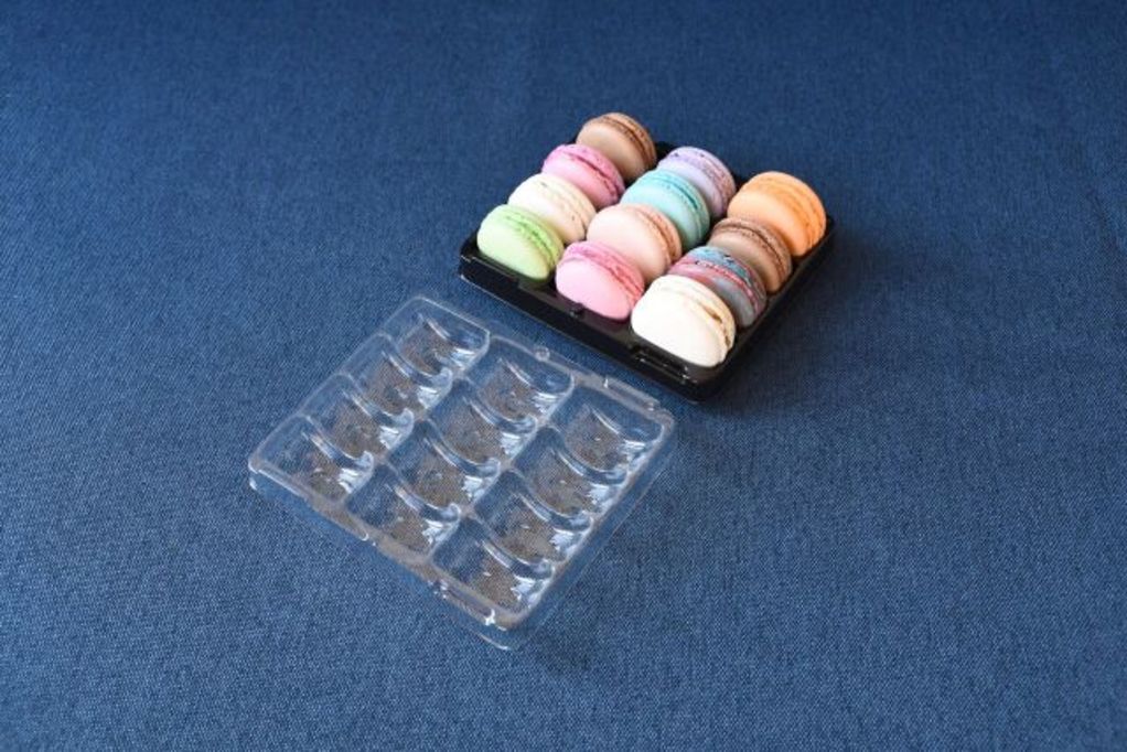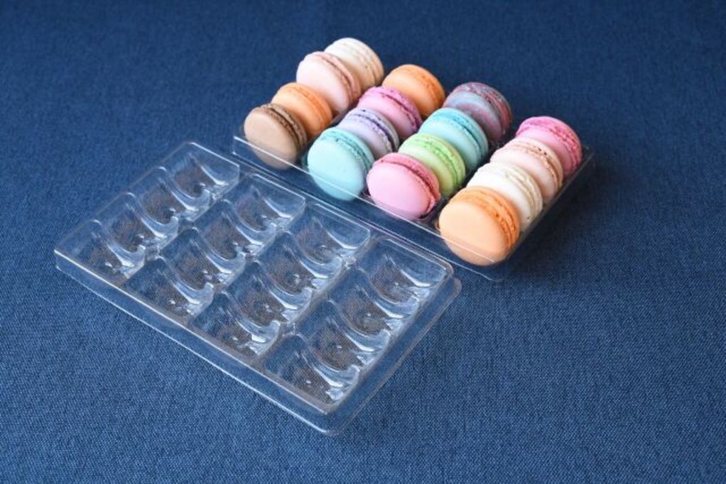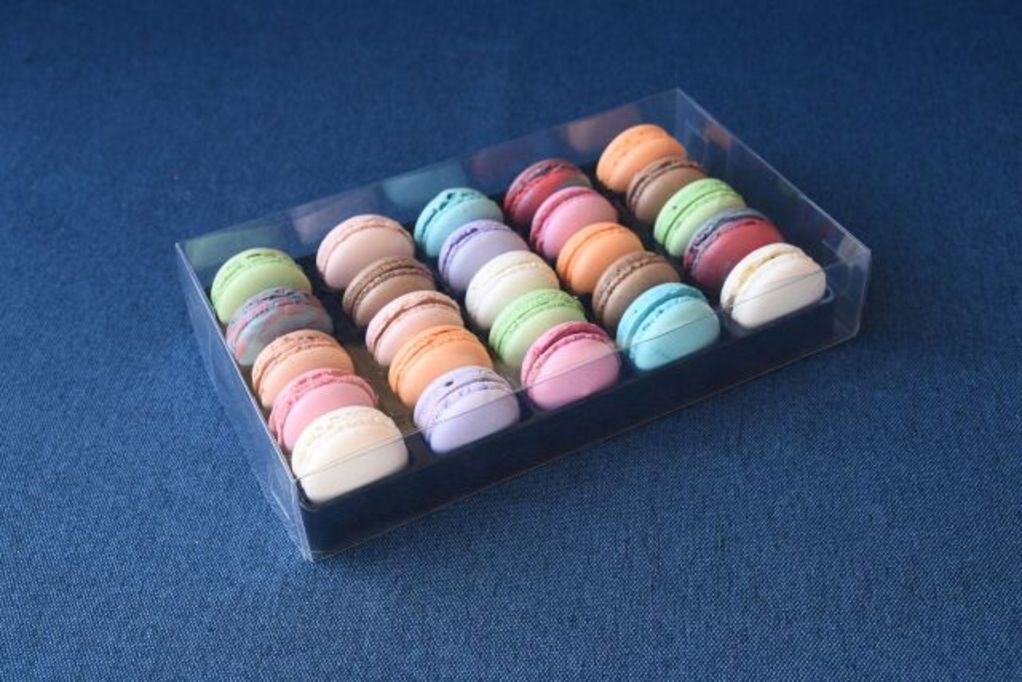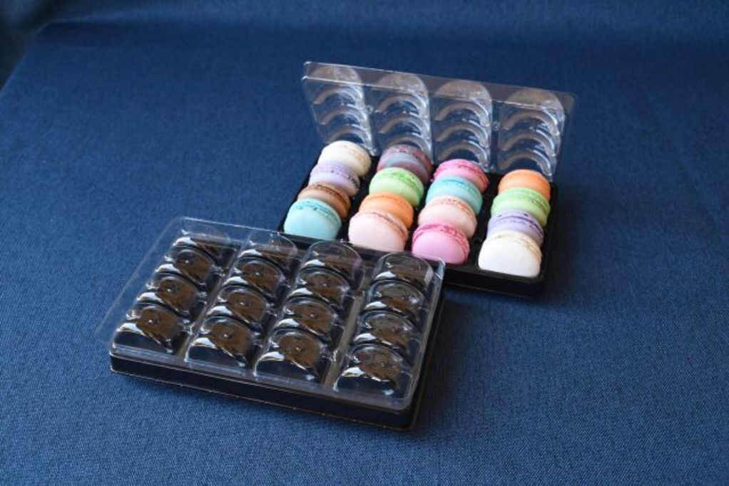 U našem bogatom proizvodnom asortimanu imamo i specijalna pakovanja za čuvene francuske kolačiće Macarons. Pakovanja su za 12, 16 ili 25 komada, gde su poklopci proizvedeni od providne PET folije, dok dna kutijica mogu da budu u providnoj, braon ili crnoj boji u zavisnosti od želja i potreba kupaca. Za pakovanje od 25 macarons-a proizvodimo i kvadratnu kutiju u koju se kolači pakuju i ona je pogodna za poklon pakovanja.